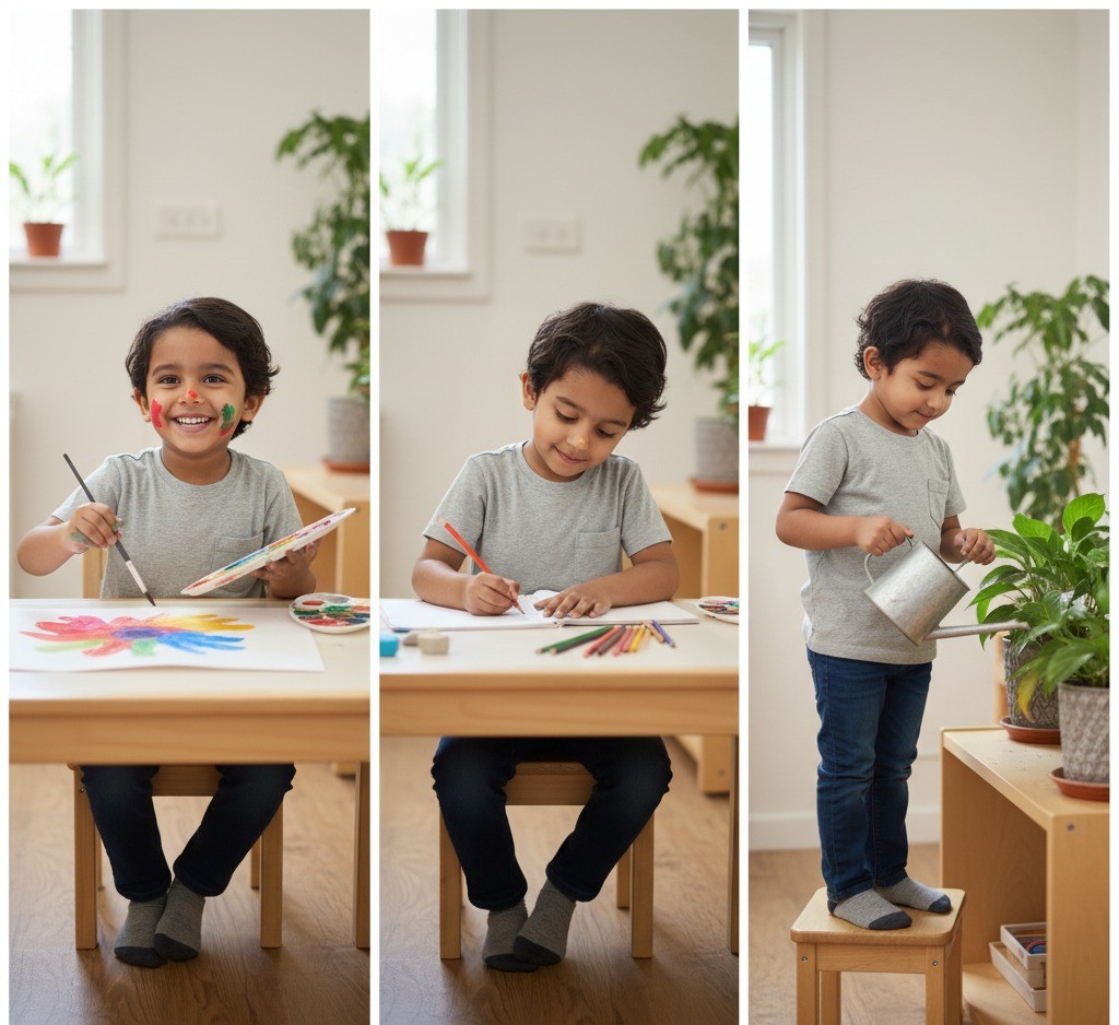 - Creative Expression: Introducing foundational experiences in Art (e.g., coloring, painting) and Music (e.g., singing, movement, simple instruments).